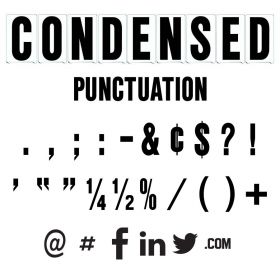 Gemini Pronto Condensed Punctuation & Symbols Set is designed to match Gemini Pronto Condensed sign letter sets and provide the extra characters needed for prices, announcements, website addresses, social media references, and everyday marquee sign messages.
